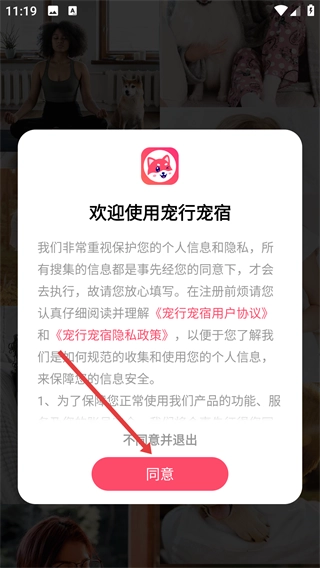 1、请先阅读《宠行宠宿用户协议》与《宠行宠宿隐私政策》,在了解相关信息保护规则后,点击【同意】按钮,即可进入应用进行后续操作。