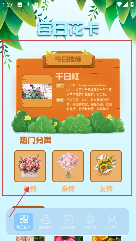 1、打开每日花卡页面,这里有【今日推荐】和【热门分类】两个板块,选择其中的【爱情】分类,即可进入浪漫爱情花的列表页面。