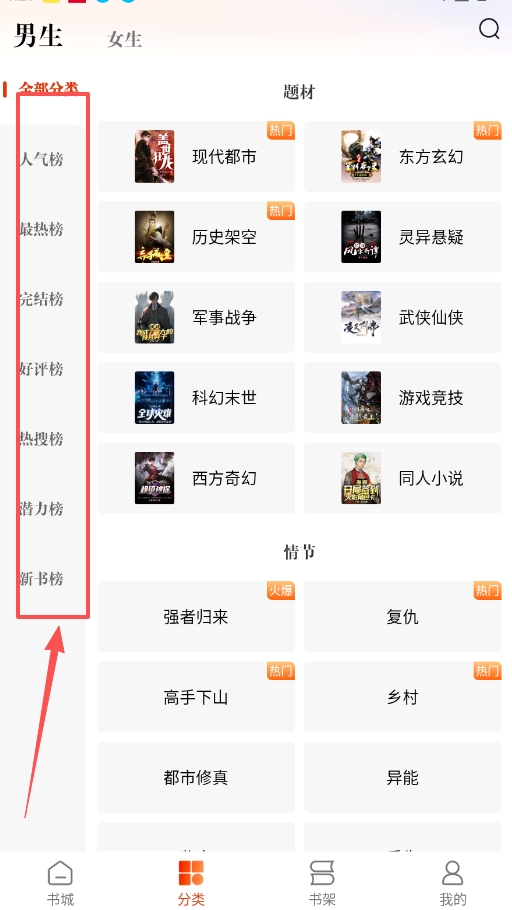 2、点击底部的书城按钮进入选书大厅,这里支持男生、女生两种视角的切换,同时设有多种榜单,如人气榜、完结榜等,还提供详细的分类标签。