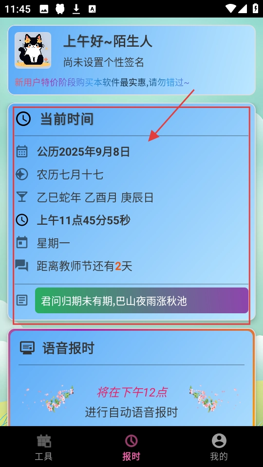 进入报时页面后,你可以查看当前时间,其中包含公历、农历等信息,同时还能了解距离教师节等节日还有多少天。