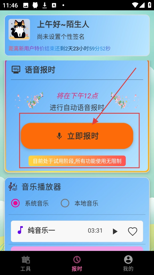 在语音报时板块中,点击【立即报时】按钮,即可马上获得语音报时服务,并且当前该功能处于试用阶段,使用次数不受限制。