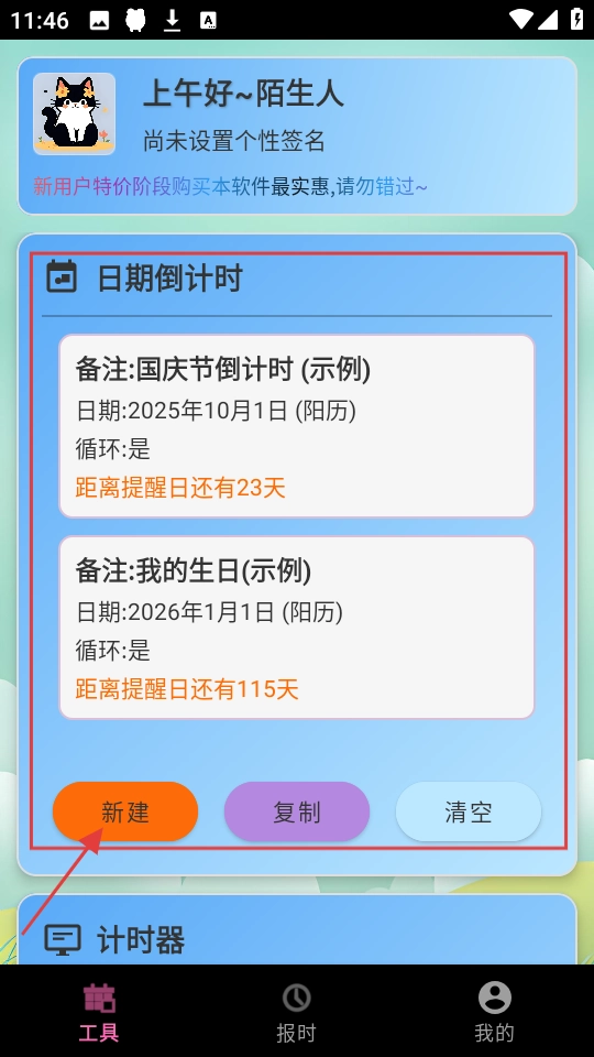 3、切换至工具页面,该页面具备日期倒计时功能,点击【新建】按钮,即可添加新的日期倒计时提醒事项。