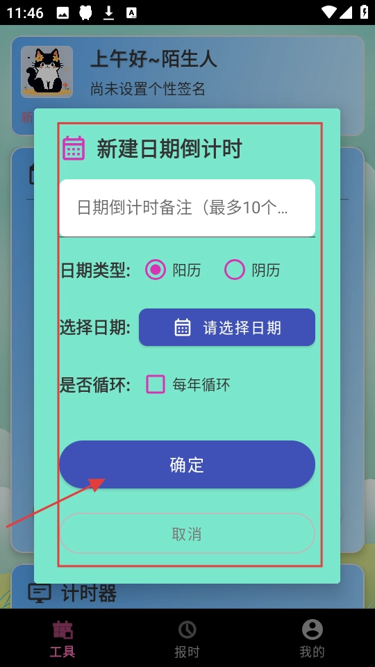 4、在新建日期倒计时的弹窗中,填写备注信息,选择对应的日期类型与具体日期,设置是否开启循环功能,点击【确定】按钮,即可完成新建操作。