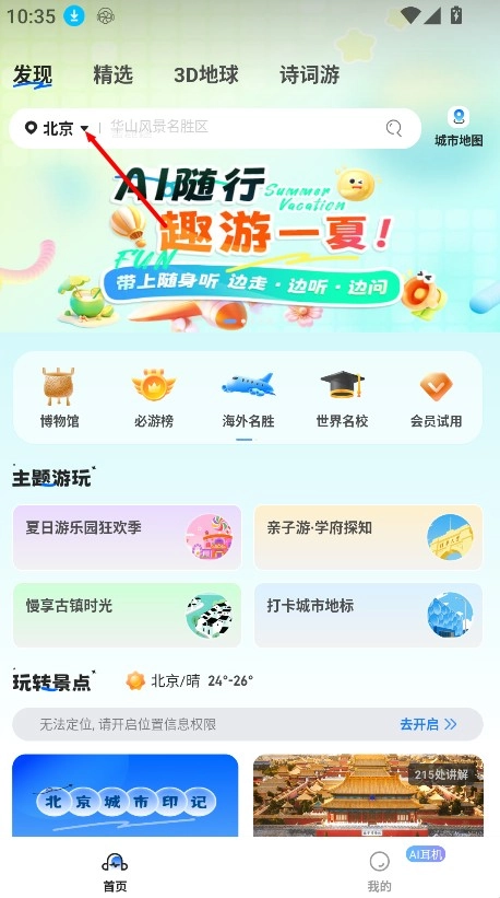 1、启动旅途随身听应用,在首页找到旅游城市选择的入口并点击进入相应界面。