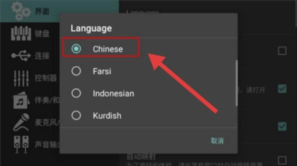 3、在语言选择弹窗里,点击选择【Chinese】选项,以此将界面设置为中文。