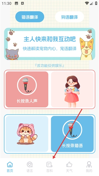在宠物互动类应用的首页,点击底部的【百科】选项,就能进入包含宠物知识与工具的百科页面。