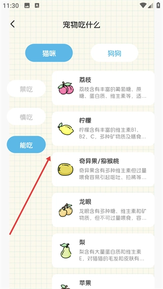 4、在同一页面切换到【能吃】分类,就能看到猫咪适合吃的食物以及相关注意事项(像荔枝、梨这类),帮助大家更科学地喂养猫咪。