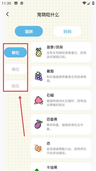 3、进入“宠物吃什么”页面后,点击【禁吃】分类,就能看到猫咪需要避开的食物以及相关风险说明(例如菠萝、葡萄这类食物)。