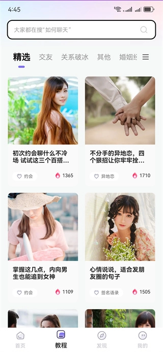 3、切换到发现板块,就能学习初次聊天的开场话题、邀约沟通技巧、表白方法指导,还能享受个性化定制情话生成服务。