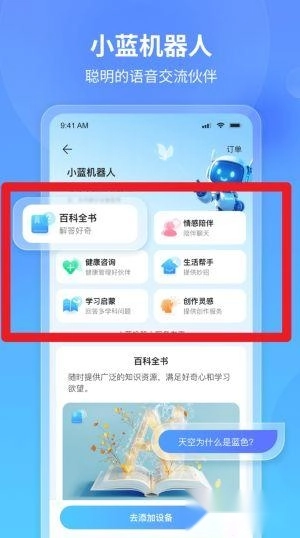 4、这款小蓝机器人具备百科全书查询、健康咨询解答、学习启蒙引导等语音互动功能,能够满足用户的日常陪伴需求。