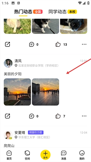 1、点击底部【同学动态】按钮,进入动态展示页面。