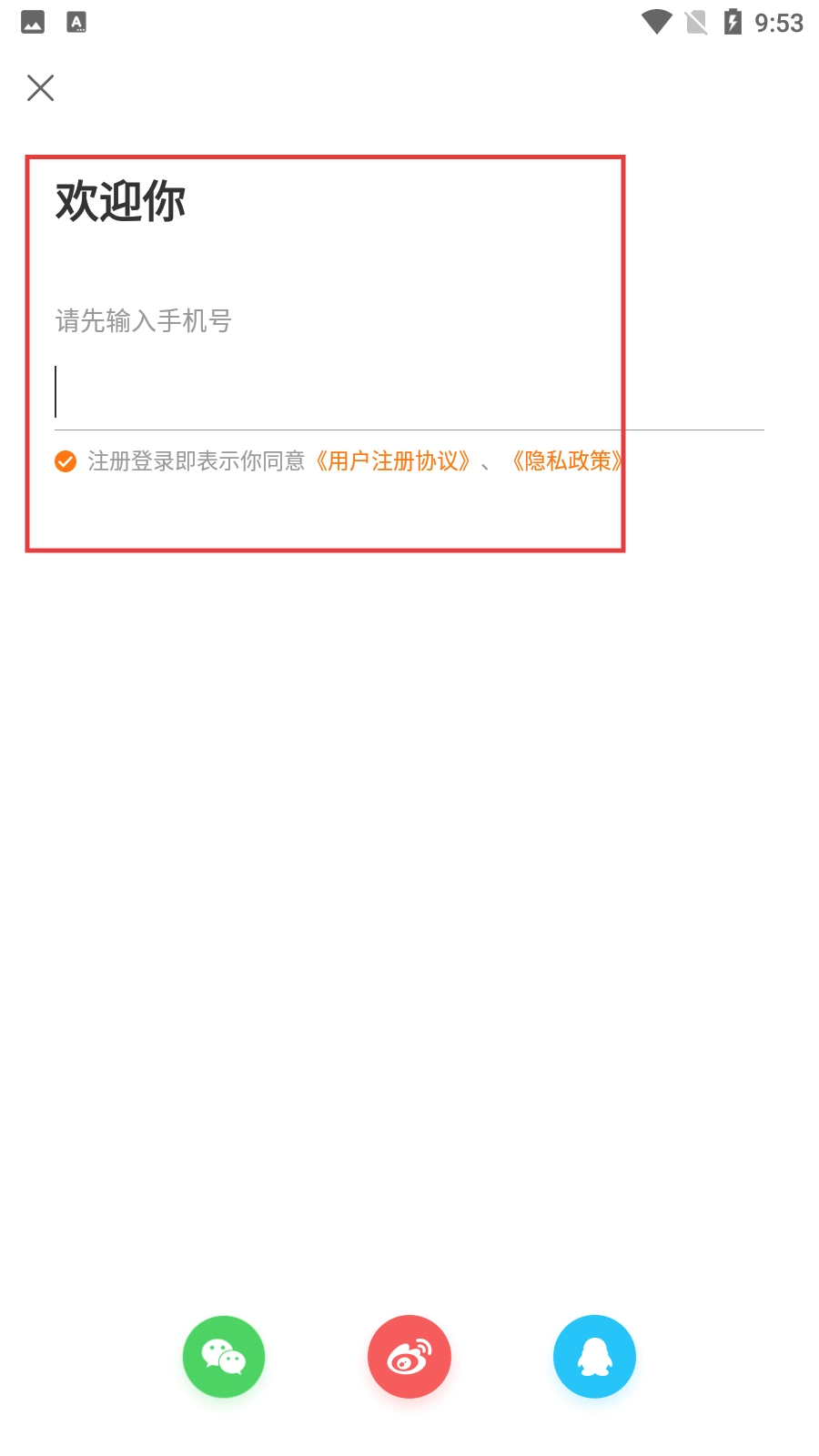 3、进入登录界面后,输入手机号码,并勾选同意《用户注册协议》与《隐私政策》。