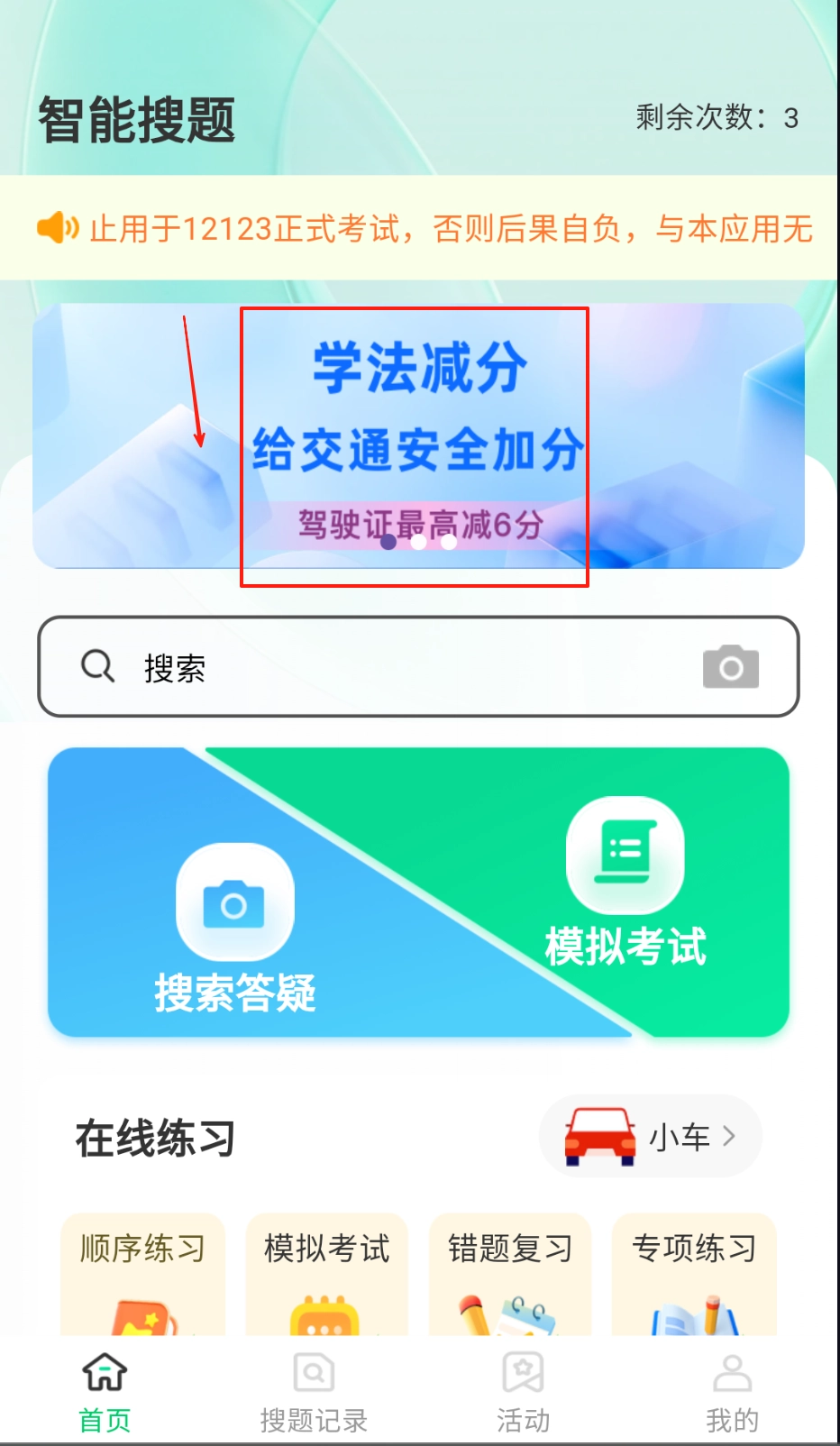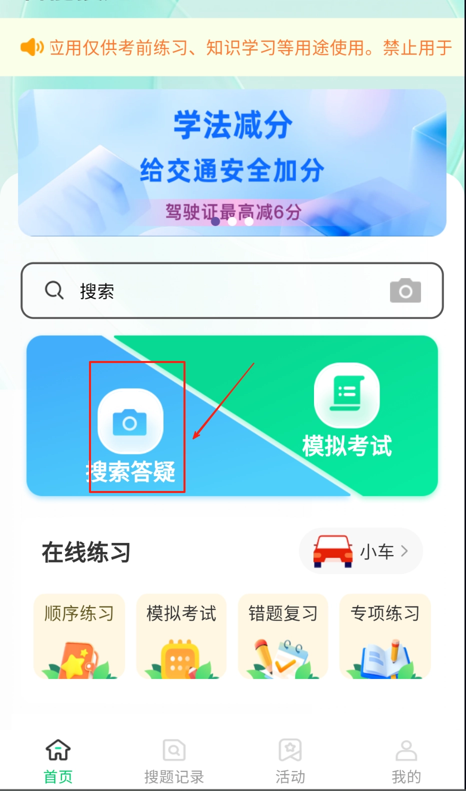 进入应用首页后,能看到学法减分基础知识板块,建议先系统学习核心考点内容。