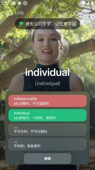 -真人纠音(对单词和例句进行智能评分并协助纠正发音)、随身听(具备单词拼读功能)