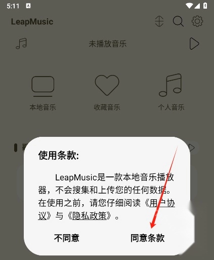 1、首先前往魔趣网下载并安装Leapmusic的新版本,随后点击“同意条款”进入软件。