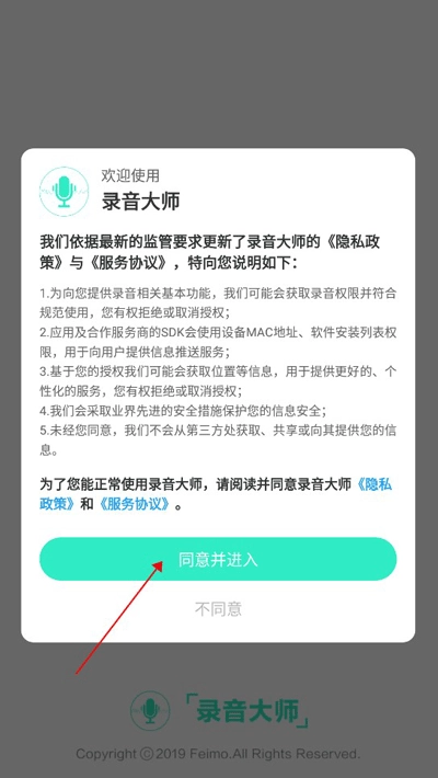 1.安装录音大师,同意隐私协议后进入。