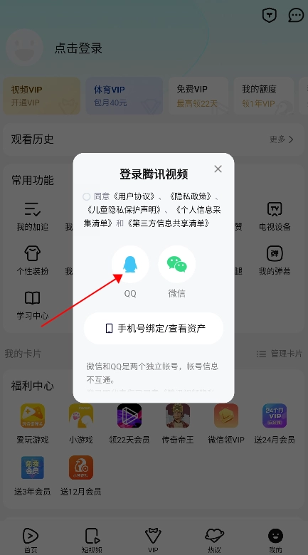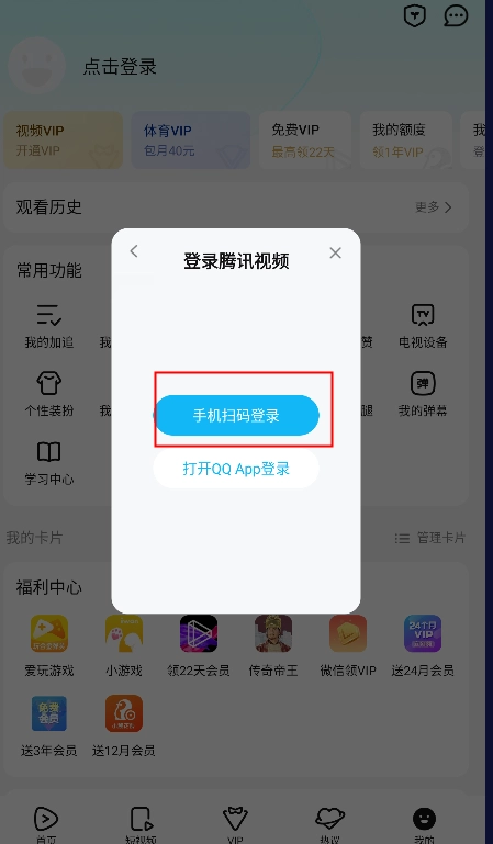 3、点击“手机扫码登录”,扫描有会员的朋友的登录二维码,就能完成共享操作。