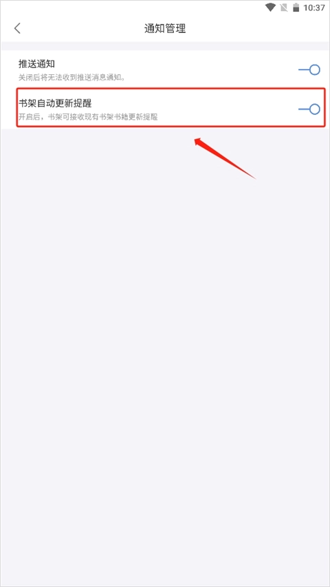 3、进入后打开"书架自动更新提醒"的开关即可。
