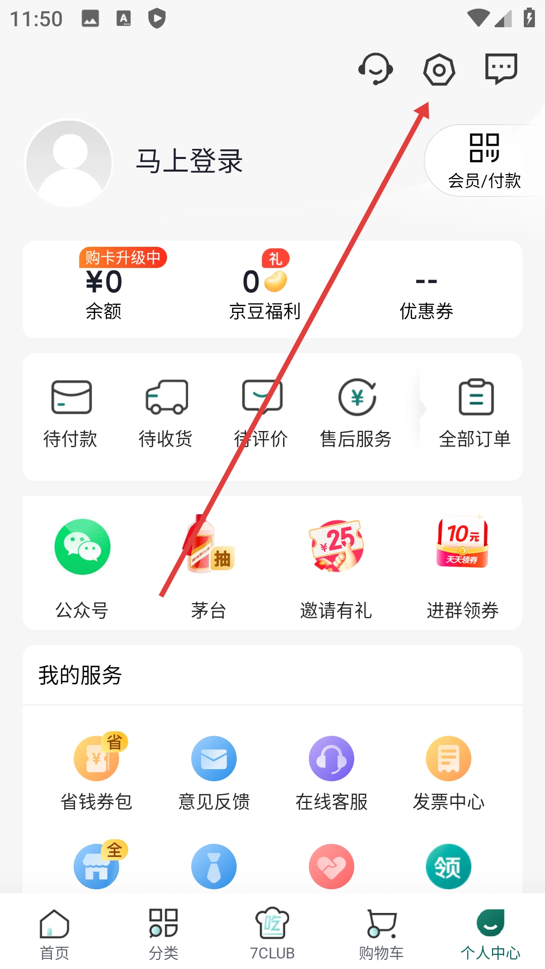 1、点击底部的【个人中心】按钮,进入个人页面后,就能看到余额、订单状态等功能区域,同时也能找到设置图标。
