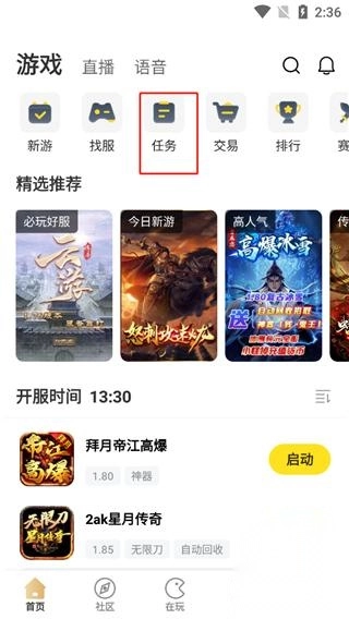 进入游戏首页后,能看到新游、找服、任务、交易、排行等板块,我们点击“任务”选项。