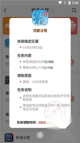 需要注意的是,每个任务都有其指定的区服,当满足任务要求后,退出游戏即可领取奖励。此外,游戏账号必须与盒子号保持一致,否则将无法完成任务。