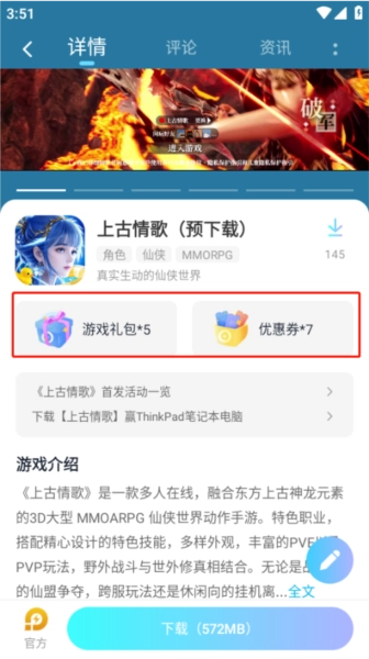 2、进入游戏详情界面后,我们能看到这里有游戏礼包和优惠券的选项。