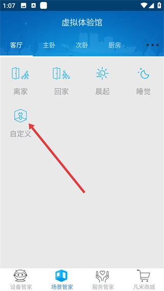 2、进入场景管家页面后,点击“自定义”选项,即可跳转至场景添加的操作界面。