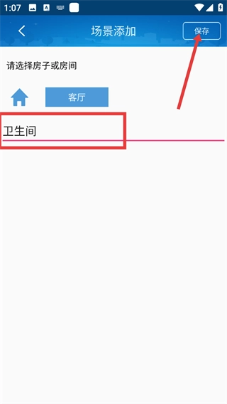 4、输入场景名称(例如“卫生间”),接着点击右上角的“保存”按钮,即可完成自定义场景的添加操作。