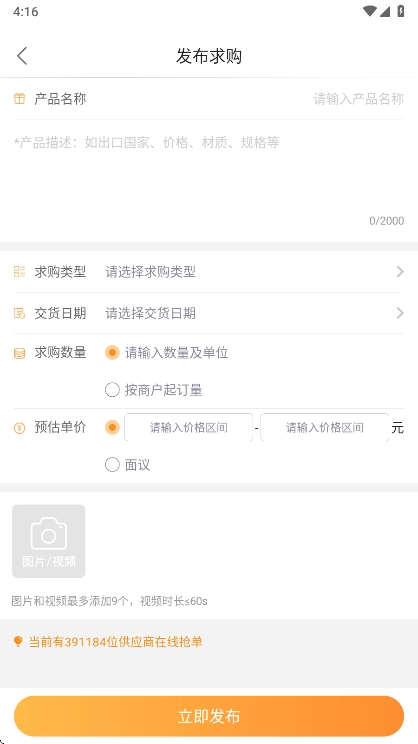 用户可以自行发布产品名称,以及类型数量来求购