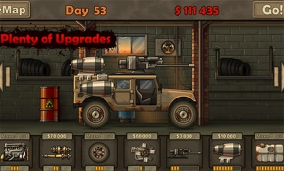 玩家需要用手里的现金为车辆进行升级,比如加装武器、安装助推器或是配备钉刺框架,以此提升自己在僵尸群中的生存概率。