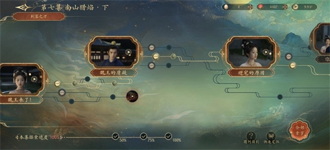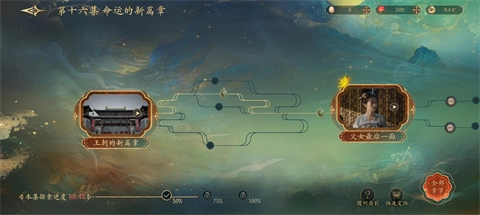 【故事线】以章节形式呈现全部故事的各个节点,点击右下角的【全部章节】按钮,就能退出当前章节并回到章节选择界面;而使用【快速定位】功能,则可以迅速返回正在推进的故事节点。