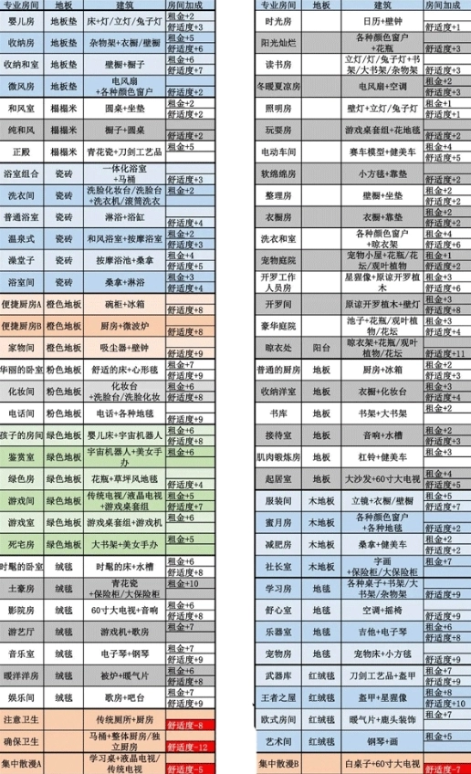 最后一张图是所有专业房间的汇总分类,这样看起来更清晰,不用再到处找了,大家可以搭建自己心仪的房间啦,赶紧行动起来!
