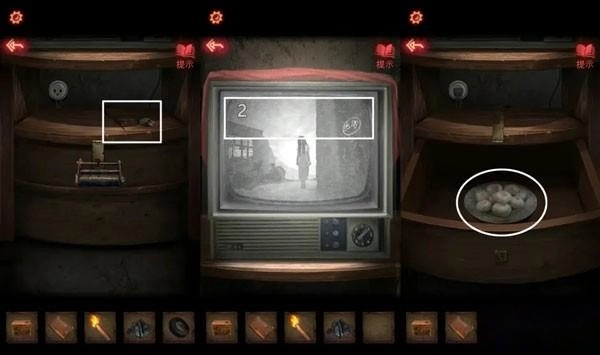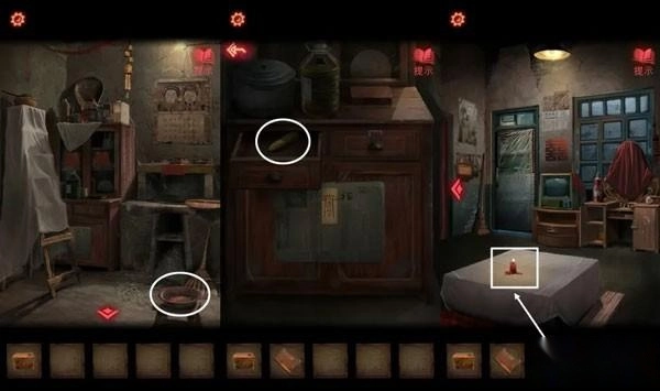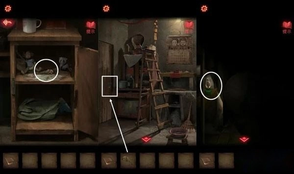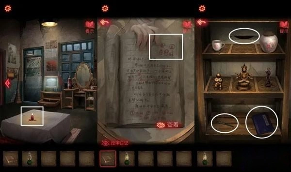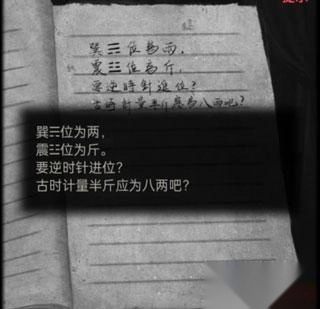 9、【煤油灯】桌上的蜡烛点燃后进入房间。按照【反字日记】的提示调整架子上的物品,即可获得【唱片】。从架子上取到【铅笔】,将日记本往后翻页能拿到【半张照片】。