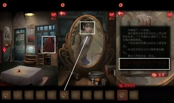 7、取下镜子上的红布,使用【反字日记】点击镜子,获取线索。