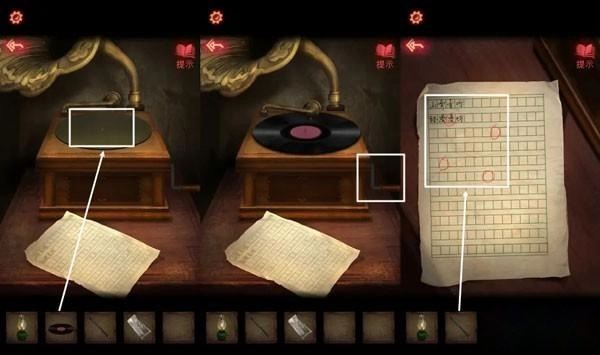 10、点击收起地上的油纸伞,小孩需注意高能提示。把【唱片】放置到留声机上,点击留声机的把手,再用【铅笔】点击桌面上的歌词纸。