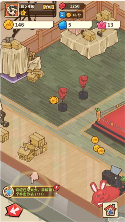 《光年计划》是一款轻松有趣的模拟经营游戏,玩家将负责运营一家格斗馆,通过不断升级设施、解锁装备来提升场馆吸引力,满足顾客的多样化需求;游戏内设有丰富任务系统,完成任务可收集金币解锁各类道具,让你在休闲时光中轻松享受经营格斗馆的乐趣!