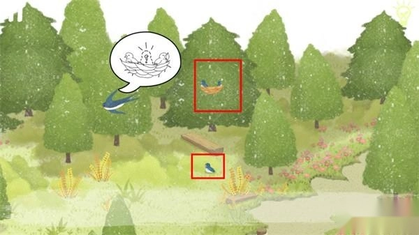 点击地面红框位置的小燕子,然后在左下角的物品栏里把“小燕子”拖动到红框处的鸟那里,这样就成功帮到了燕子妈妈,还得到了“燕子羽毛”。