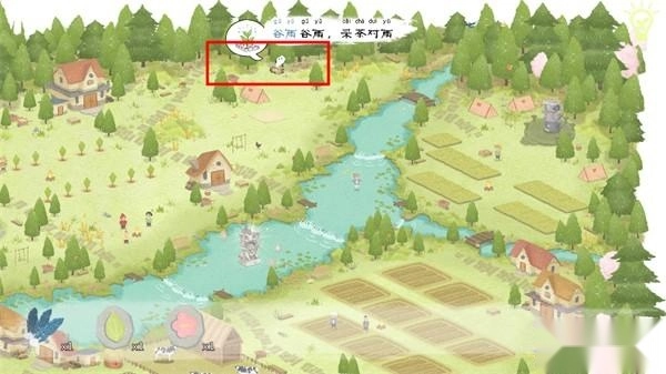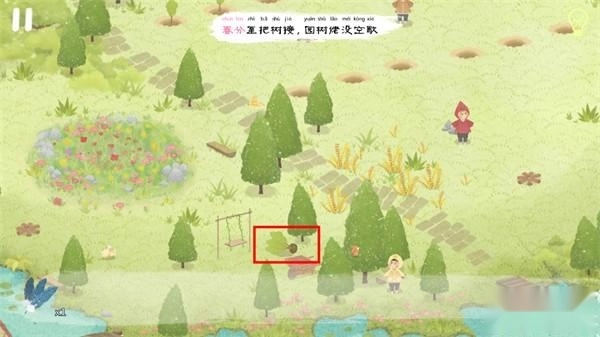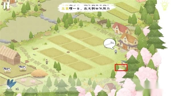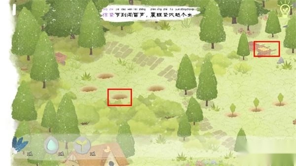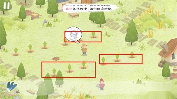 接下来我们要帮助左上方的农民伯伯种树,在场景的三个位置能找到小树苗(如下图所示)。拿到“树苗”后,把它拖到农民伯伯身旁的3个红框下方种下。