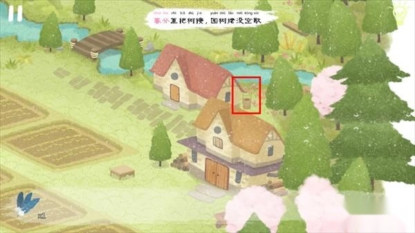 接下来要进行浇水操作,水桶放置在最右侧红房子的右边位置。只需将水桶拖动到农民伯伯身上,就能启动打水浇树的流程了。