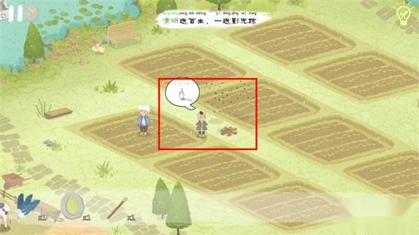 右侧的农民大叔在寻找头上绑着叶子的人,点击红框中的采茶女后,她会因误食毒草而倒下,此时再次点击采茶女,她会提示玩家去茶园采摘茶叶并带过来。