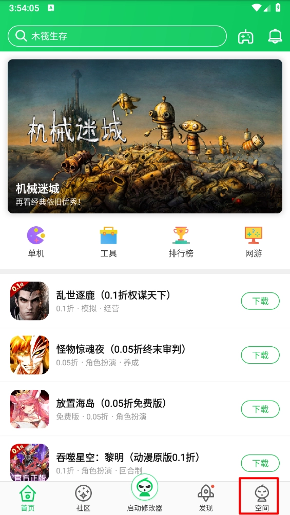 1、打开葫芦侠,进入首页,点击右下角"空间"。