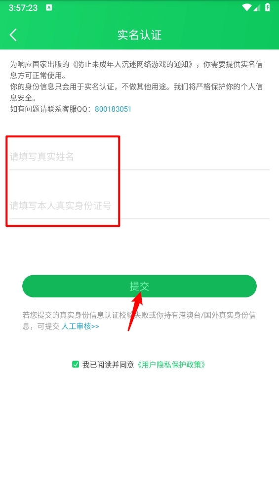 3、进入后填写实名信息,勾选隐私保护政策,点击“提交”按钮完成操作。