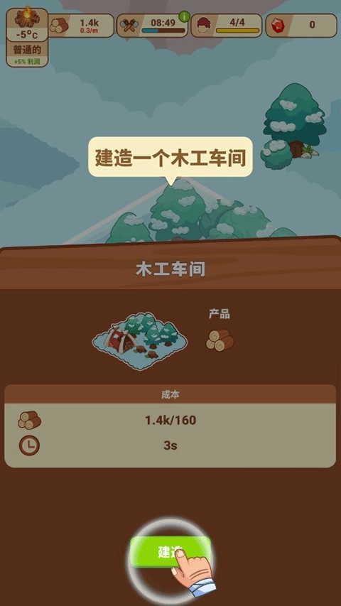 根据提示在指定位置搭建木工车间,确定位置后点击“建造”按钮即可开启设施施工流程。