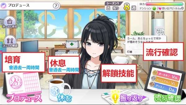 主界面四大功能模块各司其职:【Produce培育】用于执行日常成长动作;【休息】恢复体力以保障后续行动成功率;【振り返り】消耗SP学习新技能;【流行确认】查看本周Vocal、Dance、Visual三项属性热度分布,为试镜策略提供依据。