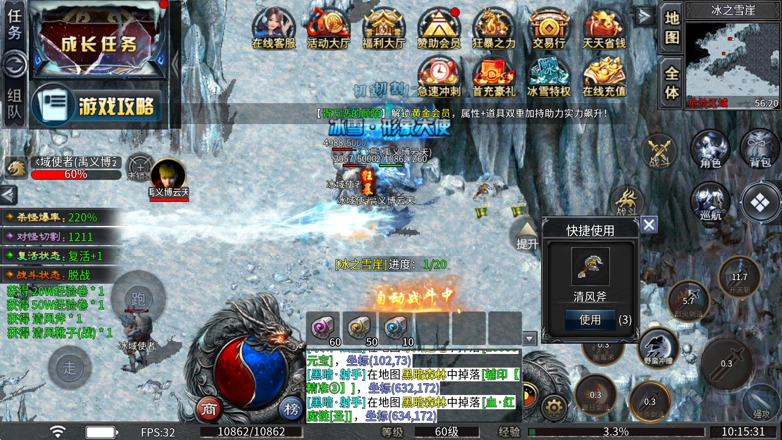 本服务器的赞助会员可免费获取至铂金等级,仅需通过打怪就能轻松升级,在收获丰厚奖励的同时,还能享有切割、爆率等方面的加成。