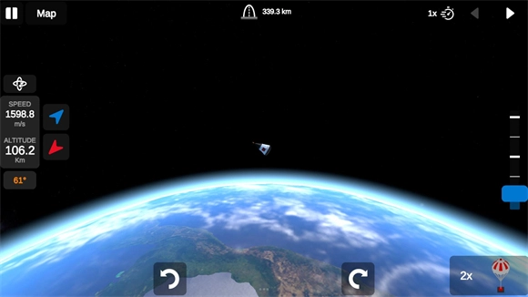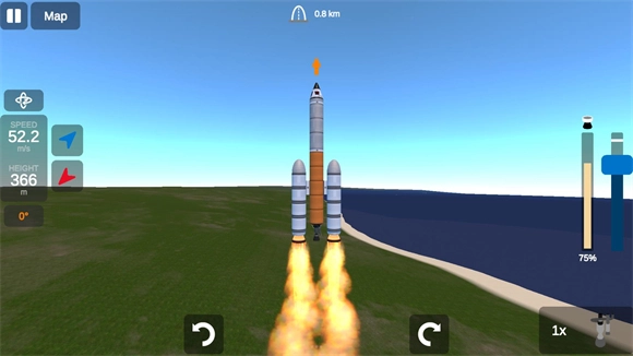 选好发射台后,点击右下角的按钮即可点火发射,右侧的蓝色按钮为引擎推力按钮。