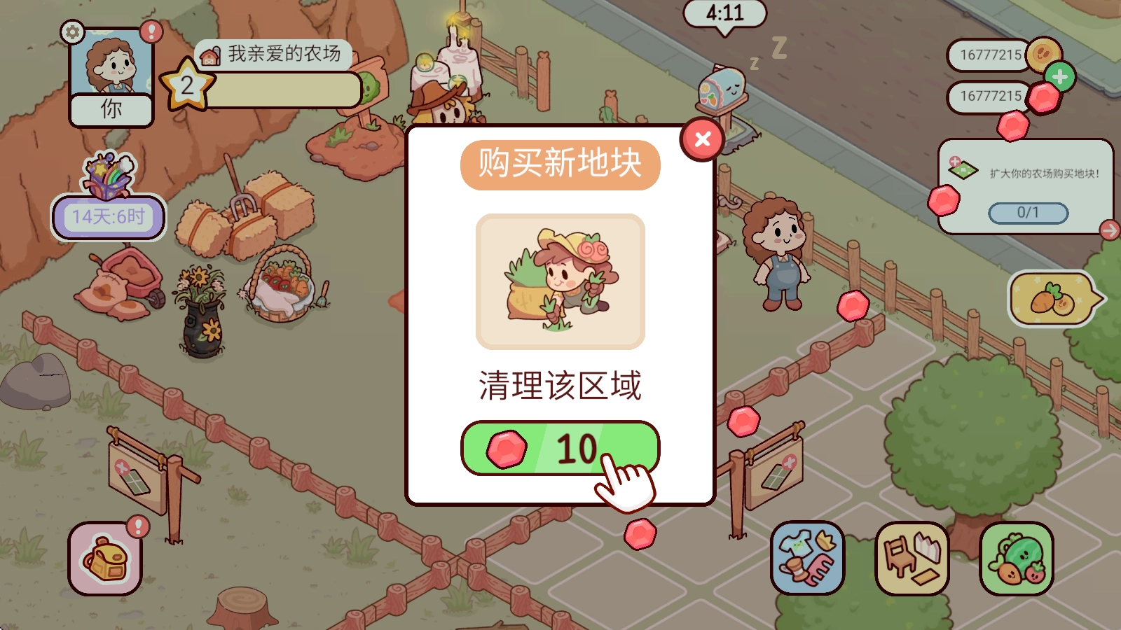 购买完成后,点击左下角的背包,就能把它们拖到土地里进行种植了。