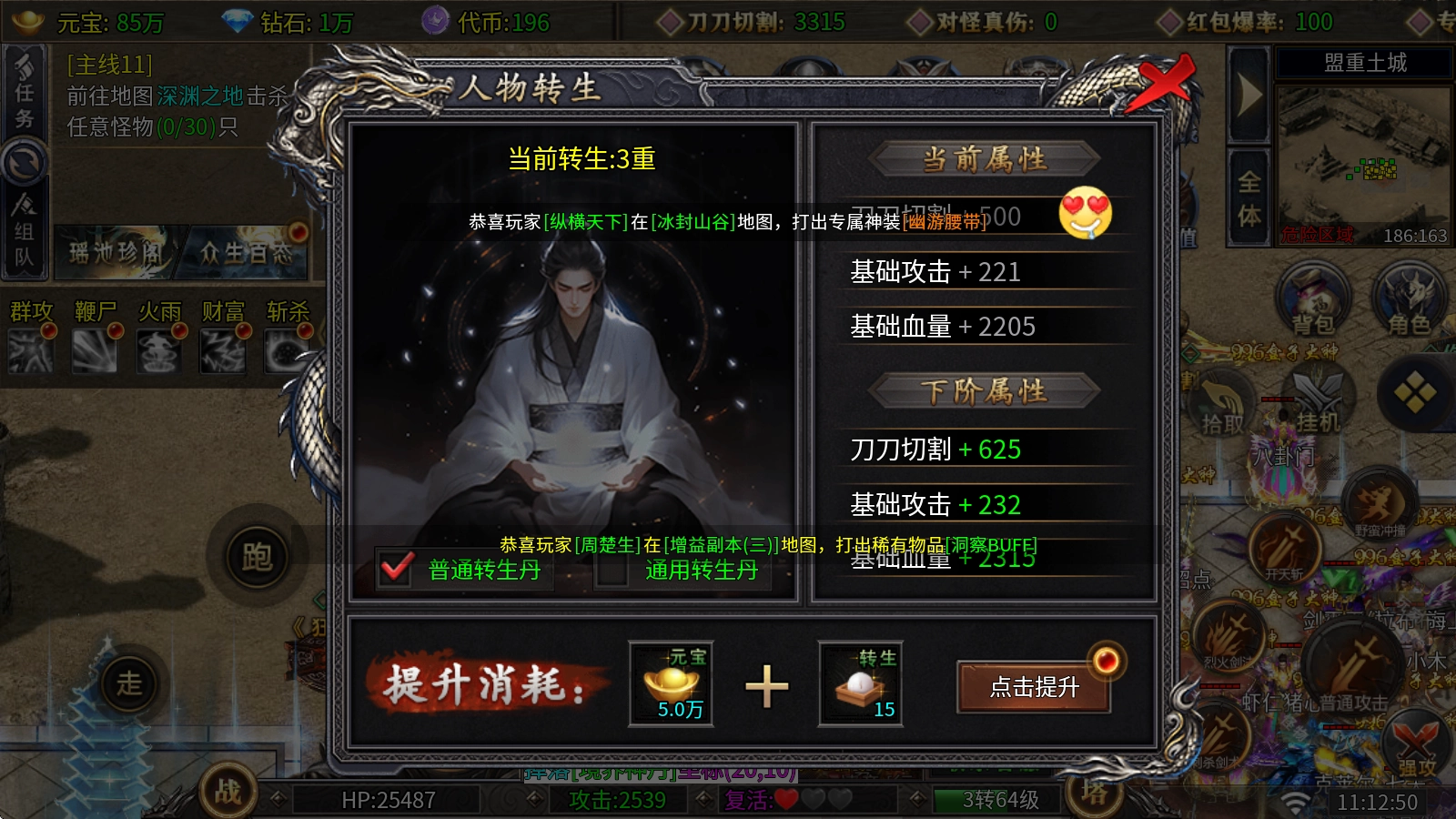 人物转生系统:消耗元宝与转生丹即可完成晋升,每提升一级都能获得攻击和血量的属性加成,同时还能显著提高切割伤害。