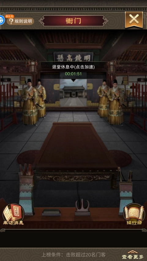 衙门每日至少能出战4次,因此至少得备有4个60级及以上的主力门客。衙门战斗的效果加成在一轮战斗里能无上限叠加,平日里可以积攒衙门蓝豆,这样在衙门冲榜的时候就能用来购买加成效果,让门客的战力得到强化。