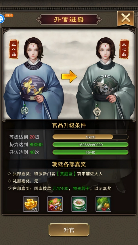 平头小吏亦有青云之志!完备的官阶晋升体系,助你畅享加官晋爵的快意。权倾朝野,无人能及!